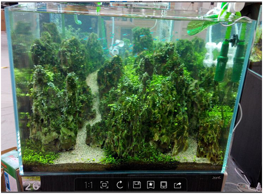 把層巒疊嶂的山峰搬進了缸里,再點綴上翠綠的水草, 這就是今年第二次在CIPS上舉辦的世界水草大師賽。水下造景為公認為是水下微縮園林,是目前正流行的休閑娛樂項目。本屆水草大師賽一共分為40組,共創作了40個水下微縮園林景觀。郎澤華是一位年輕的水景造型師,他的作品《 峭峰春榮》被評定為全場總冠軍。評委會對這件作品的點評是:缸中的石頭,按照由“近大遠小”原則,非常巧妙地組合在一起,營造出了很深的景深。同時,作者利用了很多的小素材,把很多細部做得非常的細致,尤其是前面的化妝紗鋪得很平整,讓人嘆為觀止。峭峰春榮 是一件用心、用智慧、用創意的偉大作品,是本次比賽當之無愧的全場總冠軍。